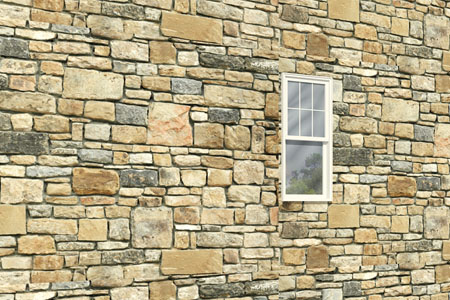 Included in Cost: 12” thick imported stone with a sand-sawed finish, flashing, wall ties, mortar, scaffolding where needed, and installation labor.